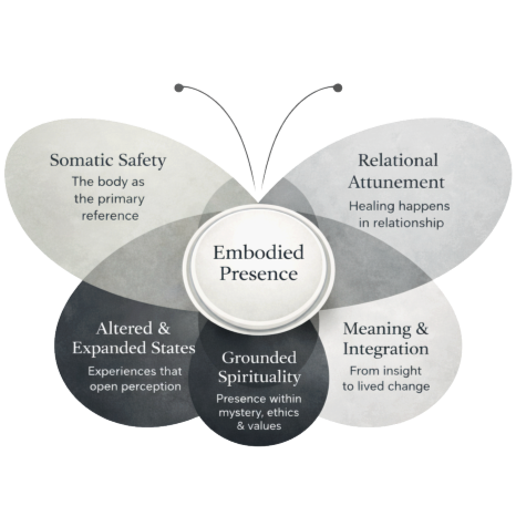 Rather than choosing between science and spirituality, we walk a middle path honoring evidence-informed methods while remaining open to depth, mystery, and the relational nature of healing & transformation. Insight is not the endpoint, but the beginning of ongoing embodiment and integration.